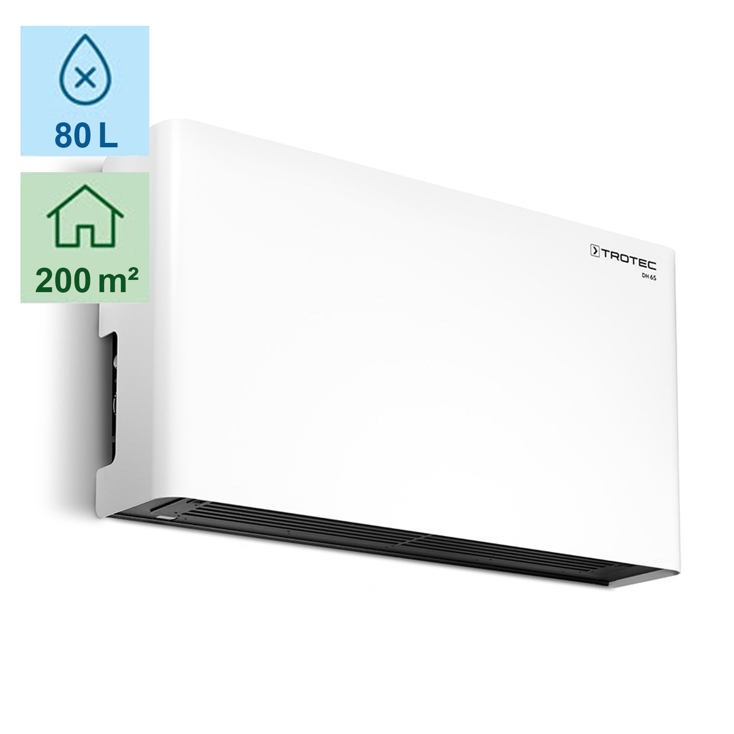 Der kompakte Luftentfeuchter für an die Wand DH 65 eignet sich bestens für eine effektive Feuchtigkeitskontrolle in mittelgrossen Gewerberäumen und zur Trocknung von feuchten Kellerzonen und Archivräumen sowie mittelgrossen Schwimmhallen.