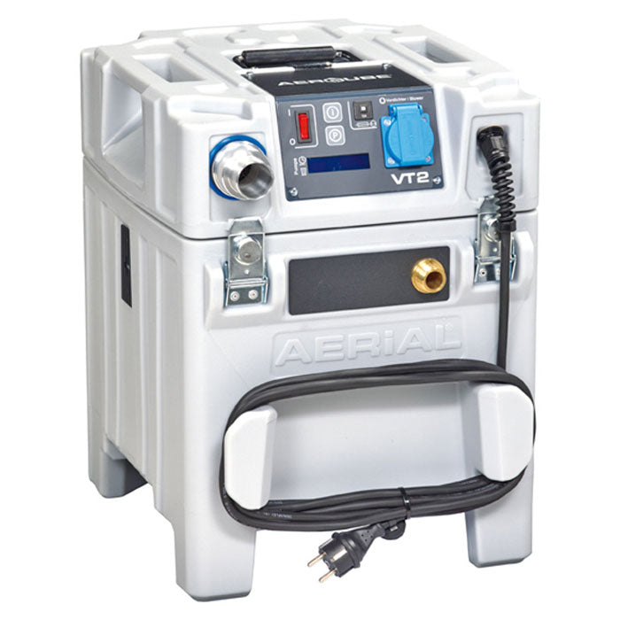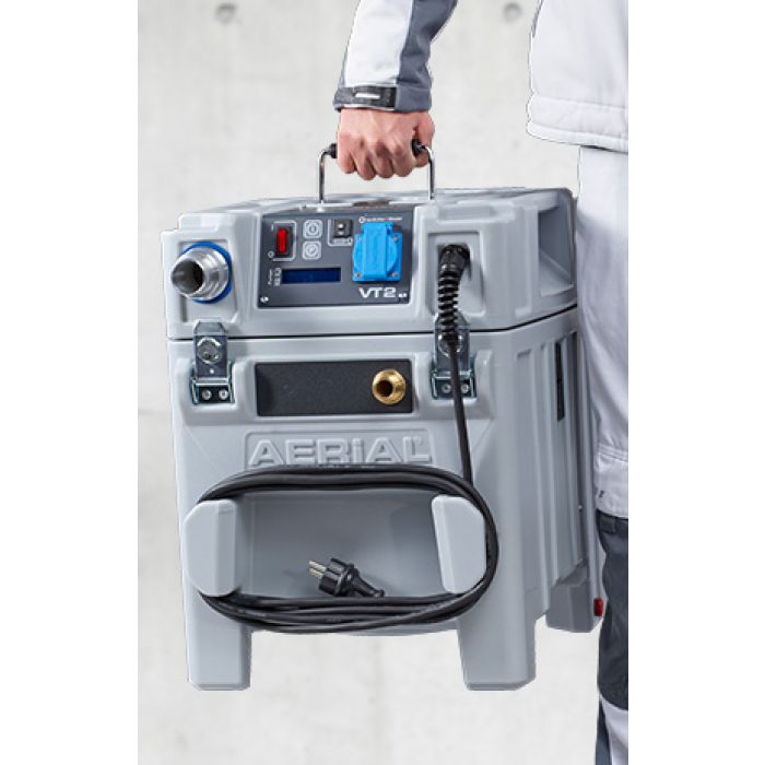 O separador de água "VT2" é um elemento da série Aerial-Aercube. Pode ser integrado no sistema de secagem Aercube em combinação com as caixas de som VP2 - 6, para, por exemplo, aspirar água parada sob os pavimentos. Adequado tanto para água limpa como para água suja.