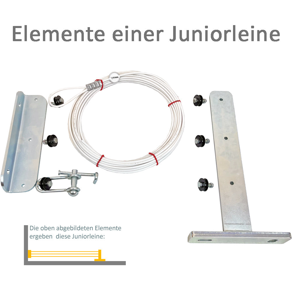 Këto kllapa janë të përshtatshme kur sistemi mund të shtrihet drejtpërdrejt nga një mur në murin e kundërt. Nëse kjo nuk është e mundur, ju lutemi merrni parasysh edhe kllapat e murit Juniorleinen, të cilat mund të montohen ose në njërën anë ose në të dyja anët përgjatë të njëjtit mur. Kllapat e këndit dhe të murit janë të pajtueshëm për sa i përket hapësirës së vrimave.