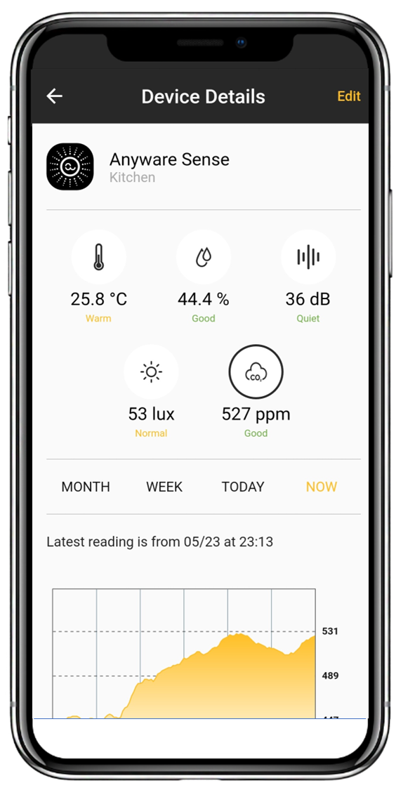 Anyware Sense Basic ist ein smarter Indoor-Klima-Monitor (Multi-Sensor), der Temperatur, Feuchtigkeit, Geräuschpegel und Umgebungslicht misst.